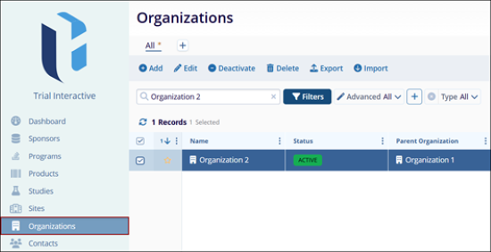 - Locate the organization to associate a parent organization with and click on the organization’s name.