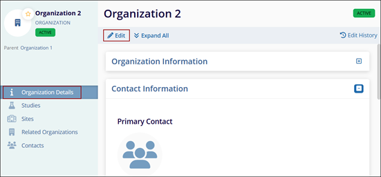 - Organization details page opens, click the Edit button to acess Contact