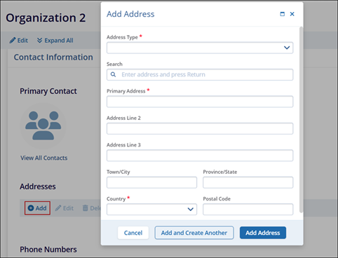 - Enter the mandatory metadata Address Type, Primary Address, Country, and Postal Code which has an asterisk (*) symbol next to the field title. Enter any additional information, as per the requirement.