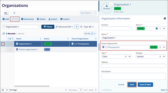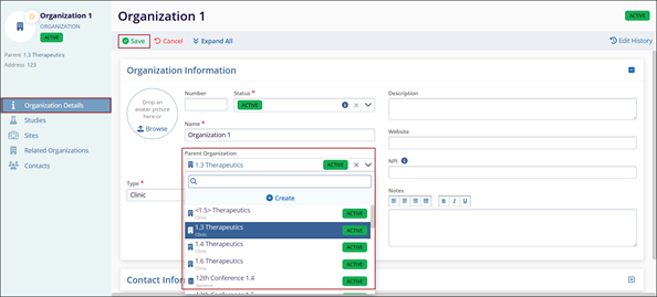 - Access the Parent Organization dropdown and associate an existing or create a new parent organization.