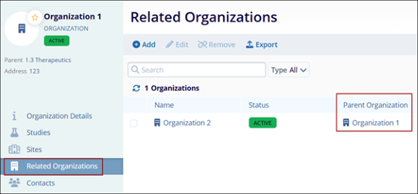 - From the Parent Organization details page, users can view associated child organizations