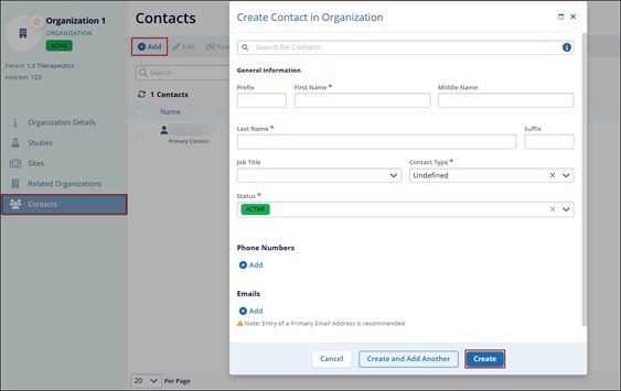 - Add the necessary information to the mandatory fields on the Create Contact in Organization form.