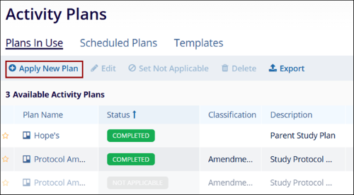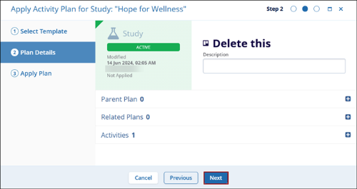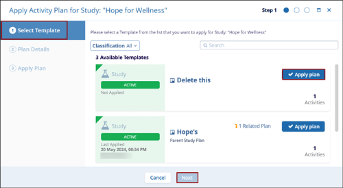 - On the Apply Activity Plan for Study screen in Step 1, either click the Apply