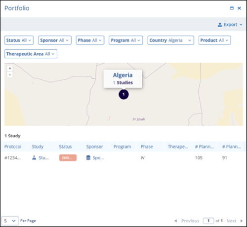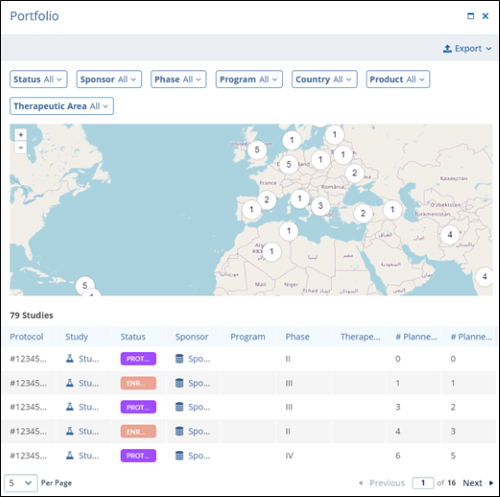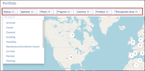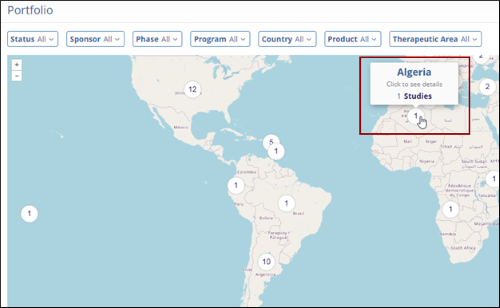 The Portfolio dashlet provides a global view of the clinical study activity. Displayed as an interactive world map, this dashlet highlights the number of studies associated with each country, offering a high-level snapshot of the geographic trial distribution.