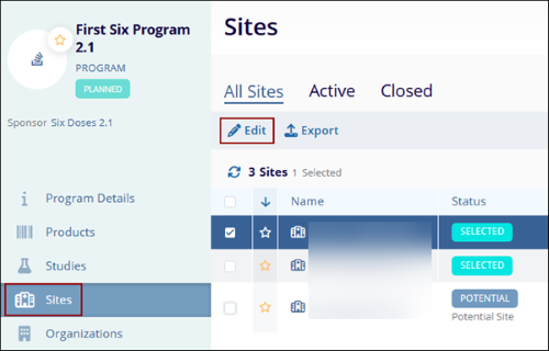 - Refer to the Editing a Site in Study section for a detailed process of editing study information.