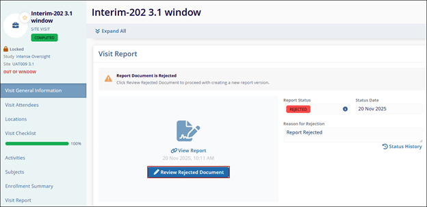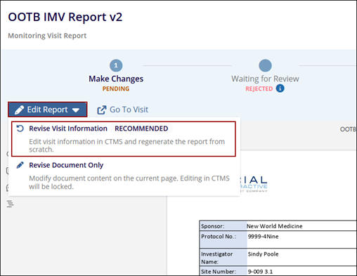 When a report is rejected, report authors can either revise the visit information and regenerate the visit report or modify the document's content to revise it.