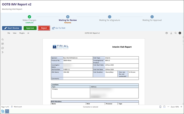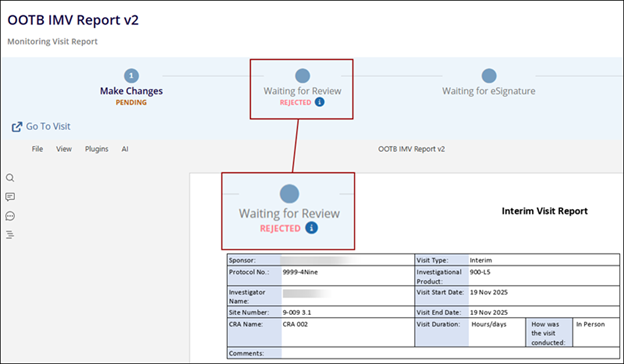 When CRAs create a site visit report and submit it for review, the designated reviewer (usually the Clinical Study Manager) has the option to reject the report.
