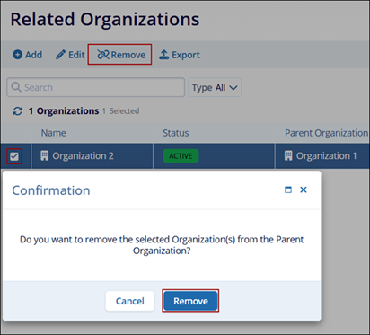 The Related Organizations screen displays all the child organizations associated with the parent organization.
