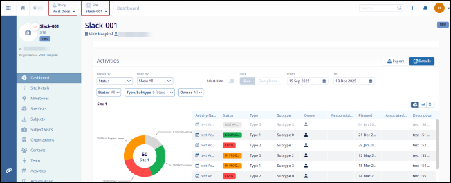 The Activities dashlet shows customizable visualization of Sites.