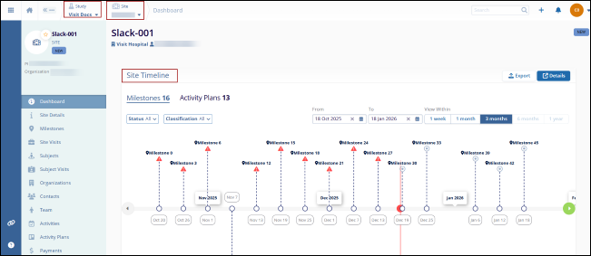 Refer to the Study Timeline dashlet having similar functionalities to the Site Timeline dashlet.