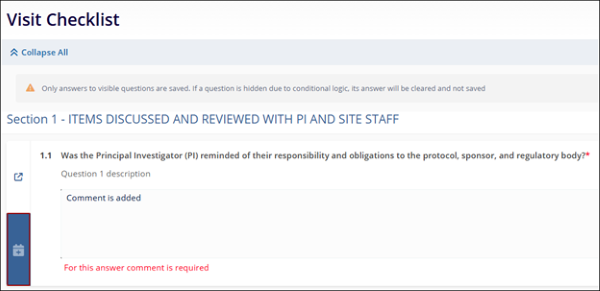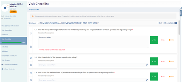 - The Visit Checklist option becomes accessible when a template is specified in the Visit General Information.