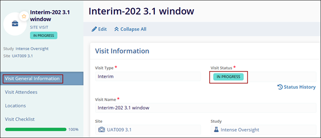 - Click on the Visit Report link and update the Report Status to In Progress.