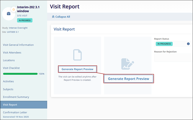 - The site visit owner can indicate whether enrollment statistics from the previous visit should be included in the site visit report.