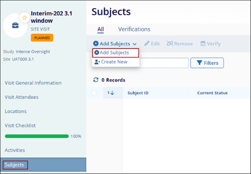 - Navigate to the Site Visit General Information screen by following the steps detailed in the Site Visit Navigation section and click on the Subjects link.
