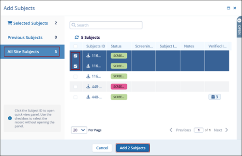 - On the Add Subjects screen click on the All Site Subjects option.