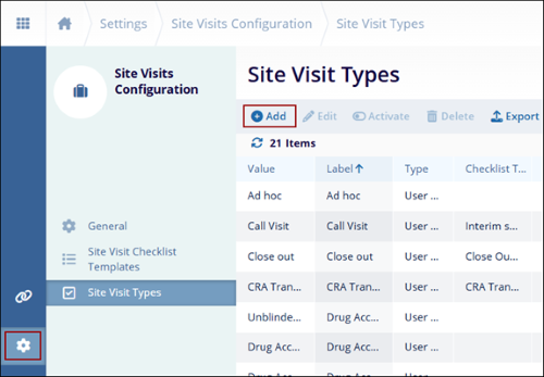 - On the Site Visit Types screen, click on the +Add button