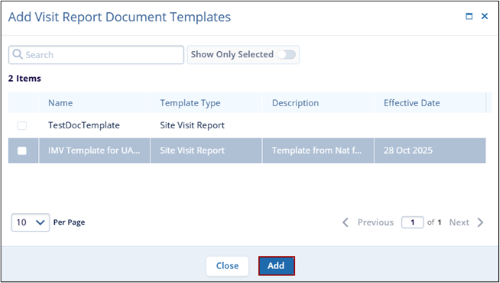 - To add visit report document templates, click on the +Add button.