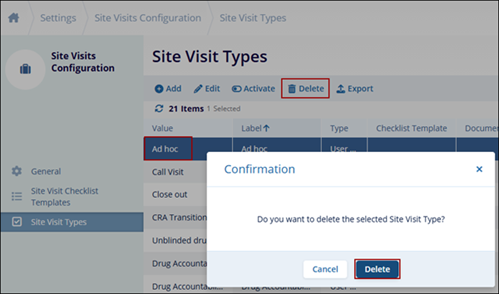 - Select a site visit type, and click on the Delete button.