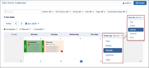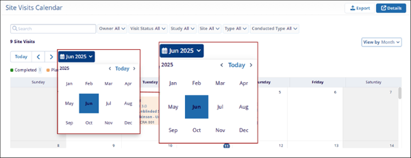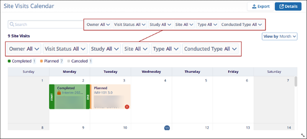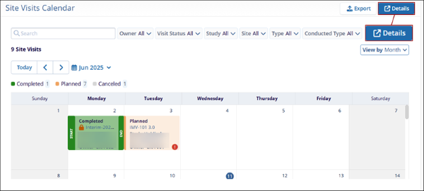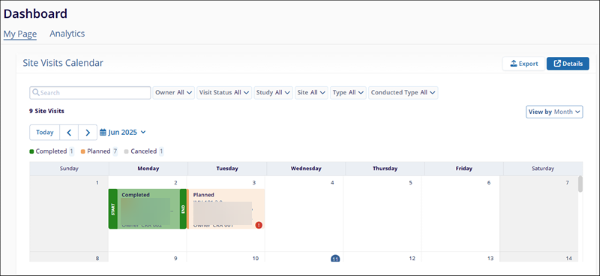 The cross-study Site Visits Calendar at the domain-level on the My Page dashboard, enables users to view site visits in a calendar format. This calendar offers functionality similar to the study-level site visits calendar, while providing sufficient details to identify the associated study and site for each visit.