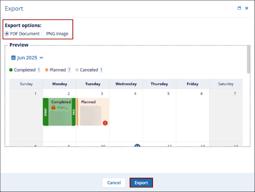 - On the Site Visits Calendar dashlet, click on the Export button.