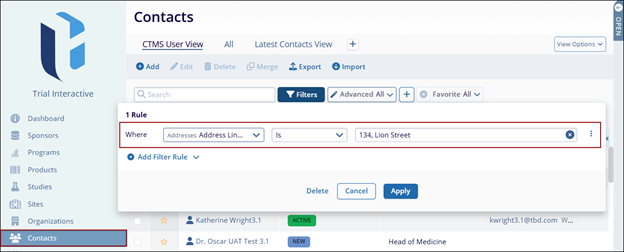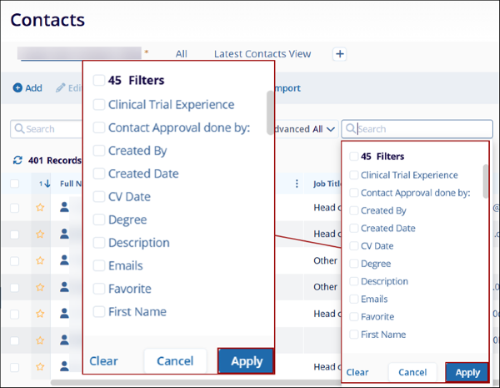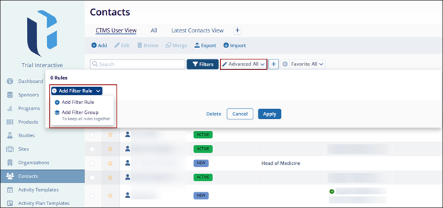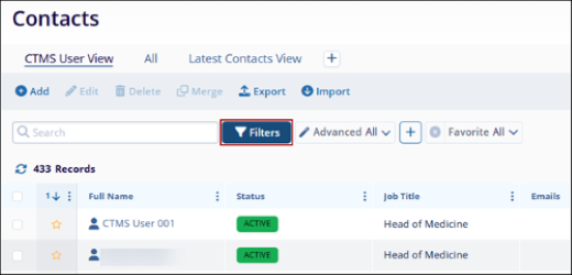 To apply filters to the Contacts view, click on the Filters button to add the Standard and Advanced filters.