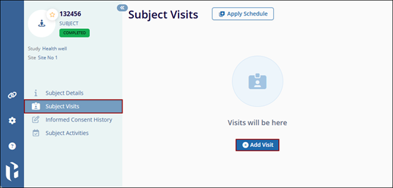 - Click on the Subjects Visits in the Navigation menu on the left side of the screen.