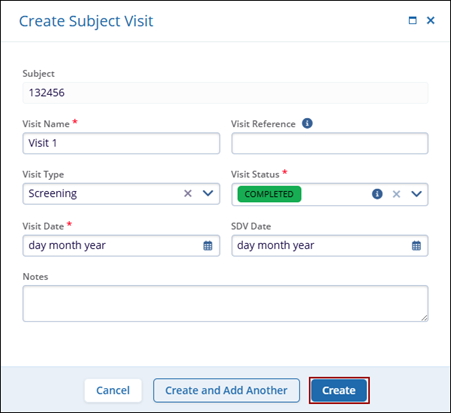 - Enter the mandatory metadata to create a subject visit i.e., Visit Status, Visit Type, Visit Date as indicated by an asterisk (*) symbol next to the field title. Enter any additional information, as necessary.