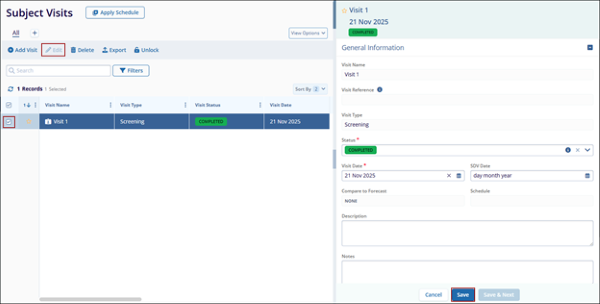 - On the Subject Visits screen, select a visit by clicking on the checkbox.