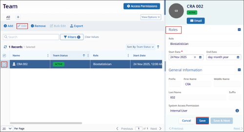 - Once an entry has been made, the role will not be editable. If there is an error, delete the entry and create a new one. For correct entries, if a team member moves on to a new role within the study, the study manager should enter an end date for the old role and create a new entry for the new role. This is to aid in providing tracking for each study team member and the roles that they may play throughout a study.