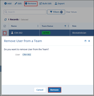 TI CTMS separates the study team from access permissions for the study. Managing the study team is done from the Team area at the study level by using the navigation links at the left side of the screen.