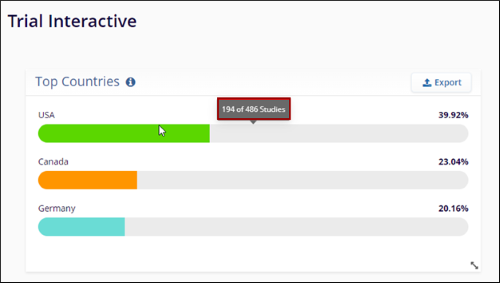 The Top Countries dashlet within the Portfolio dashboard shows the three countries with the highest percentage of studies that include at least one site, counting each study once per country, regardless of site count.