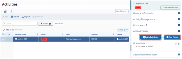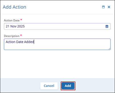 - On the quick view panel, navigate to the Actions Taken section and click on +Add