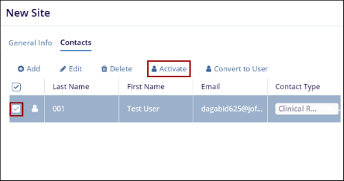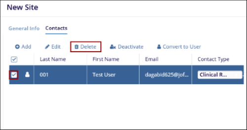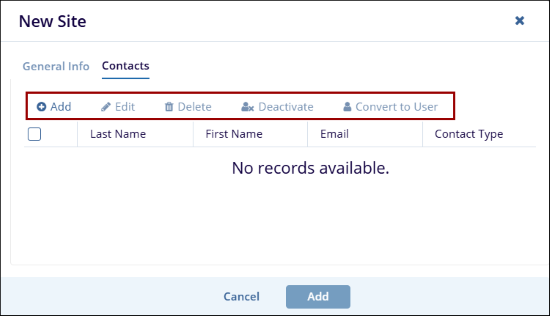 On the Contacts tab, perform the following to configure the list of contacts within the site.