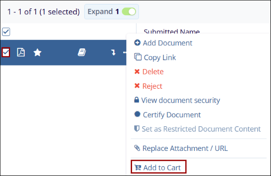 - Locate the document which is to be added to the Document Cart and select the checkbox next to it.