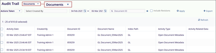 Users can retrieve the audit trail based on selected parameters. The options in the Actions Taken dropdown are displayed according to the chosen parameter.