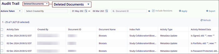 User Interface for Deleted Documents: When the audit trail for Deleted Documents is retrieved, the data is presented in the following columns.