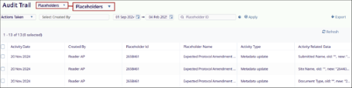 - Placeholders: When the audit trail for Placeholders is retrieved, the data is