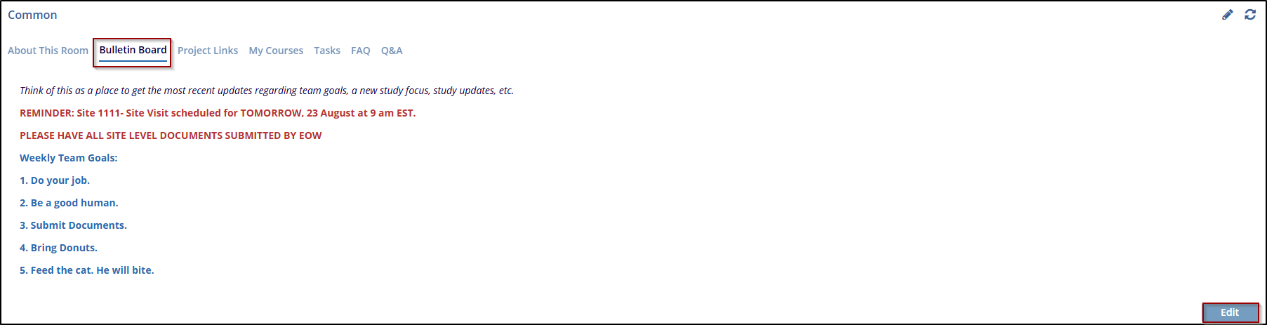 The Bulletin Board tab is set up by administrators to provide important messages and updates to the team. It can include information related to the room, study-related announcements, or updates about any issues or actions needed. This section serves as a central communication hub for keeping all team members informed. Both Administrators and Managers have permission to edit the content in this area, ensuring that relevant information can be updated as needed.