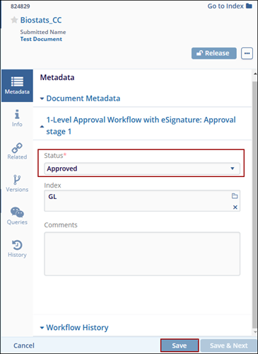 - Click on the Save button so that the document moves to next stage of approval or signature.