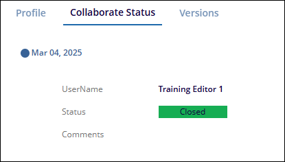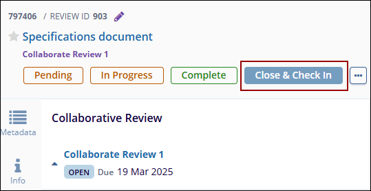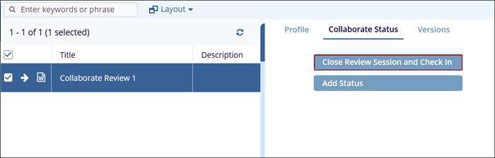 Once the collaborators have completed editing the document, any one of the collaborative reviewers can close the session and check back in the document. A team edit can closed directly from the documents metadata panel from the Documents library and from the Collaborate modal.
