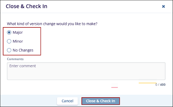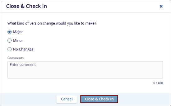 - On the Close & Check-In popup, select any one of the version change options, optionally enter comments, and click on the Save button.