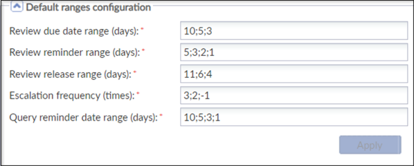 - Query reminder date range: If the user does not respond to a query with a document, reminder emails are sent to the query recipients on the nth day as specified here. So, if the setting is 10; 5; 3 reminders will be sent on the 10th day, 5th day, and the 3rd day.