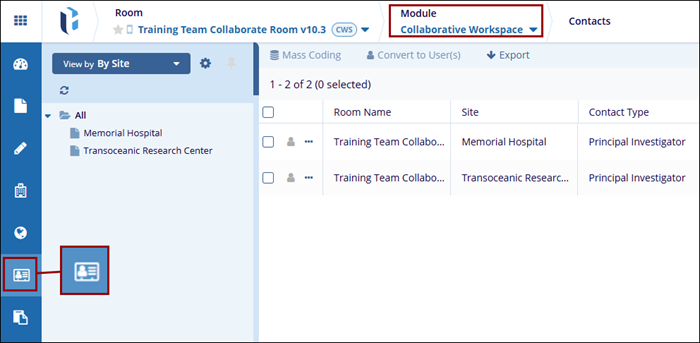 The contacts assigned to a site are shown in the Contacts modal within the Collaborative Workspace module. Users with the necessary access permissions can edit contacts, apply mass coding, convert contacts into users, and export contact details and metadata.