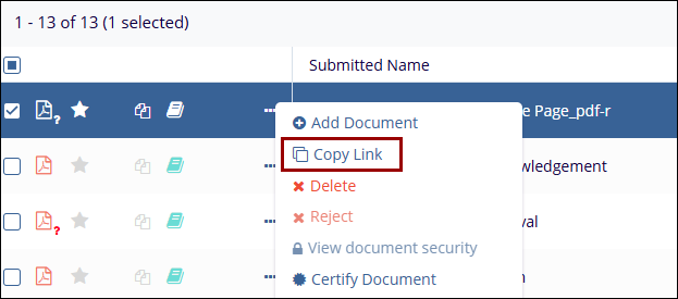 If referencing a specific document to another room user for review, the Document ID Number can be provided or the Document Activities menu can be opened to select Copy Link, which will copy a direct URL link to the clipboard. Anyone using the link must have sufficient access to the study room in order to view the document.
