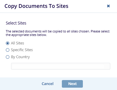 On the Copy Documents to Sites window, select sites pertaining to specific criteria by clicking on the radio buttons.