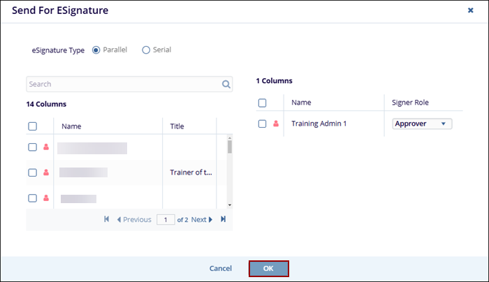 - Move the requested signatories into the right column of the ‘Send for eSignature’