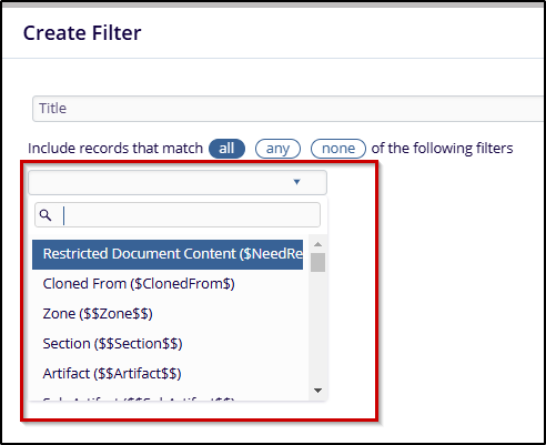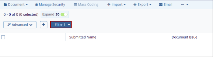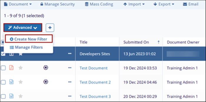 Click on the Advanced button and select the + Create New Filter option above the documents grid. The Create Filter window opens.