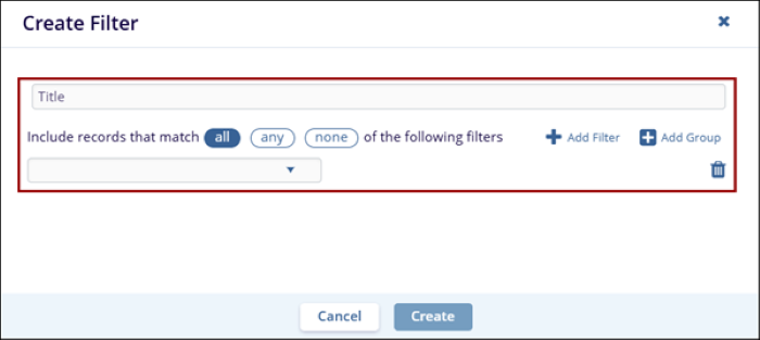 - On the Create Filter screen, enter a title for the filter and click the + Add
