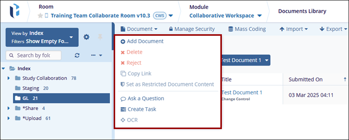 The options available in this dropdown menu are only available once a document has been selected in the grid and are a subset of the options available in the Document Activities menu mentioned in the section above.