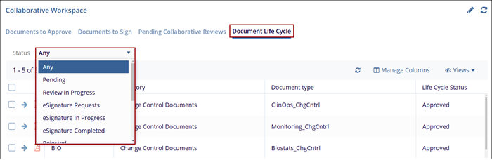This dashlet displays documents based on their review status. Users can select a review status from the dropdown options and view documents in that particular status. For example, documents in the below-mentioned review status can be filtered and displayed.